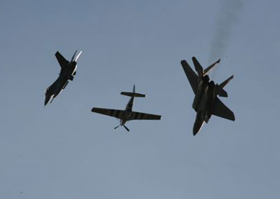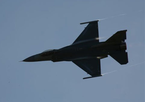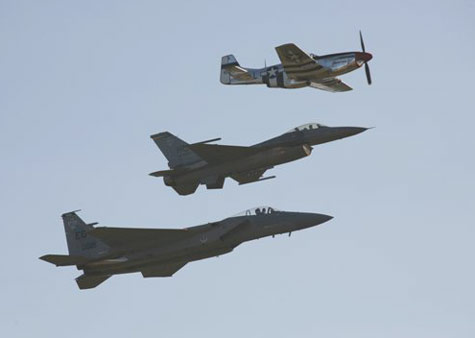 ![]() F-15 Eagle, F-16 Falcon and P-51 Mustang demonstrate perfect precision formation flying during the Heritage Flight at the 2008 Stuart Air Show. | ![]() U.S. Air Force F-16 pilot Russ T. Spiggott banks a high speed turn during his last air show performance before transferring to duty as an instructor. |