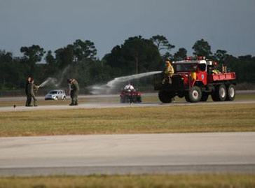 ![]() USAF Capt. Russ T. Piggott is doused following his last air show demonstration flight at the 2008 VNA Show in Stuart. He will be transferring to California to serve as an instructor pilot for the Air Force. | ![]() Capt. Russ T. Piggott, center, prepares to celebrate his last F-16 demonstration flight at the 2008 Stuart VNA Air Show. |