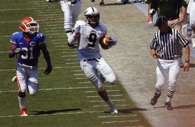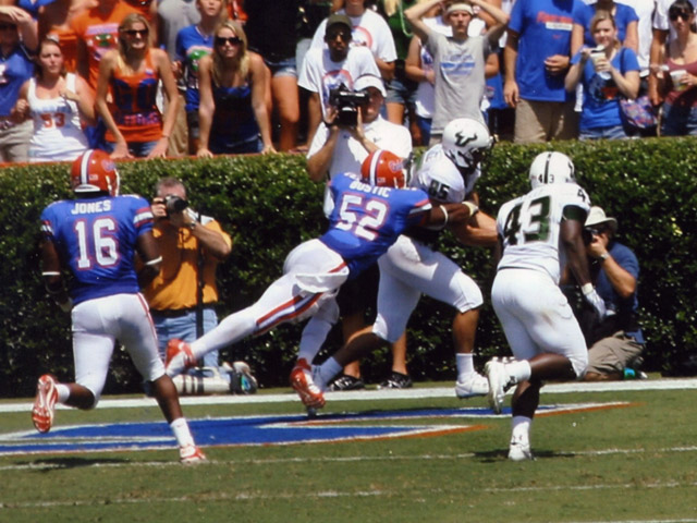 | ![]() University of Florida cornerback Brian Biada zeroes in on University of South Florida wide receiver Evan Landi as the Florida Gators beat the USF Bulls 38-14. |