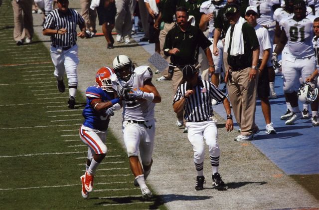 ![]() Biada forces Landi out of bounds at the end of a 51-yard pass reception, his only catch of the day and the longest for the Bulls. | ![]() Gator Jonathon Bostic fails to strip the ball from Andrew Ketchel. The two-yard touchdown made history as the Bulls took the lead 7-0 in their first game in the Swamp. | ||