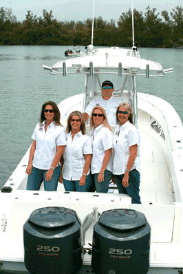 Getcha SomeSTORY AND PHOTOSBY GREG GARDNER In the rough waters of competitive kingfishing, few women dare to fish much less field a team that places second out of 300 boats in the invitation-only nationals. The four Fort Pierce women fishers aboard Getcha Some are lifelong friends who along with Captain Robbie Yancy brought home the trophy and a 21-foot Contender last year from Biloxi, Miss. The most important piece of equipment in their efforts was a 31-foot Contender fully loaded with all "the bells and whistles," said Melissa Blandford. "This boat is special because we're the only boat in the SKA [Southern Kingfish Association] that has an all-female crew," she said. "We're not out there for a suntan. We're out there to fish." "The boat is bad to the bone and it is fast," said Christy Blandford. "And Robbie is a great captain. I've done all kinds of fishing, but kingfishing is my favorite. It's so exciting when you catch that big fish." After nine years on the SKA tour spending too much time and money fishing, Robbie Yancy sat down with his wife and asked how they could keep going. Joy Yancy suggested forming a team with her friends and Team Getcha Some was born. "The first tournament they were hooked," said Captain Yancy of his crew. "They ate it up and loved every minute of it. They pay attention and they listen. We have a great time." Yancy also has a few tricks to get that extra competitive edge from his boat. "I have a different T-top which has less resistance. I carry my rods on the side using special clips so they don't get a beat up. We have two separate bait wells and beanbag chairs for the girls." "I chose this boat myself because it is a fishing machine," said Yancy. "We drove 90 miles offshore and back three days in a row at 45-55 miles per hour. I wasn't the least bit worried about equipment failure. When the seas are 5 to 7 feet we still fish." "When the weather is rough we get to the fishing spot fast," said Dina Hicks. "It rides great and fast in rough water when you have to check in at a certain time. That boat and the way it handles. We have a unique crew," she said. "We're all lifelong friends and sometimes it's stressful and dangerous," said Blandford. "For us to be able to get off the boat at the end of the day and still be friends is pretty special in itself." |