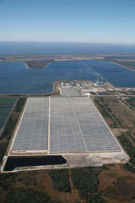 Fuel From The SunSTORY AND PHOTOS BY GREG GARDNERSolar power is now being generated on a huge scale in Indiantown at the Martin Next Generation Solar Energy Center, the largest of three solar fields operated by Florida Power & Light. With 500 sprawling acres that provide space for 192,000 rotating mirrors, the solar plant creates steam for turbines at a natural gas plant, generating power whenever the sun is shining. The hybrid-solar thermal facility is the world's first tied to an existing natural gas plant. "The project continues to progress ahead of schedule," said Greg Brostowicz, lead media relations specialist for FPL, on a recent slow drive around the solar field. "The facility is producing electricity for our customers with free fuel from the sun, directly reducing fossil fuel usage, and right now we are fine-tuning the systems to optimize performance." Aside from the wind, the massive array of glass, steel and aluminum is eerily silent except for a "tink, tink, tink" every few minutes as the frames follow the sun across the sky. The mirrors were manufactured in Spain at the only kiln large enough to handle the job. The German-made pipes carry 700-degree fluid to heat water, making steam to power the turbines. The 7,100 steel pylons support 6,800 aluminum frames that hold the mirrors as they follow the sun from east to west. Lauren Engineers and Constructors from Abilene, Texas, supervised the project, which provided 1,100 jobs over two years. It was originally projected to cost $476 million, but FPL now estimates the price tag to be $400 million. As solar power's popularity worldwide has grown over the past three years, so has the volume of production, driving prices down. FPL estimates the plant will avoid the emission of 2.75 million tons of greenhouse gases that would have been produced from fossil fuels over its estimated 30-year lifespan. According to the Environmental Protection Agency, that is the same as taking 18,700 vehicles off the road every year. Electricity for 11,000 homes will be added to the power grid now in use by the existing oil and natural gas plants on the site. "It's definitely an advantage to be right up against the existing infrastructure," says Brostowicz. FPL's DeSoto County solar field is in a rural area and the Brevard County voltaic cell solar project is under construction near Kennedy Space Center. When complete, the Indiantown plant will employ just a handful of people. FPL's goal is to spray every mirror down once a day using a truck to drive the 52 miles of aisles between the rows of 30-foot-tall shiny glass. At 75 megawatts, the Martin County plant is the largest thermal solar field outside of California. Adjacent land could be used for future expansion. When FPL's three plants are online, Florida will be the nation's second-largest supplier of utility-size solar power. Created on 01/26/2011 |