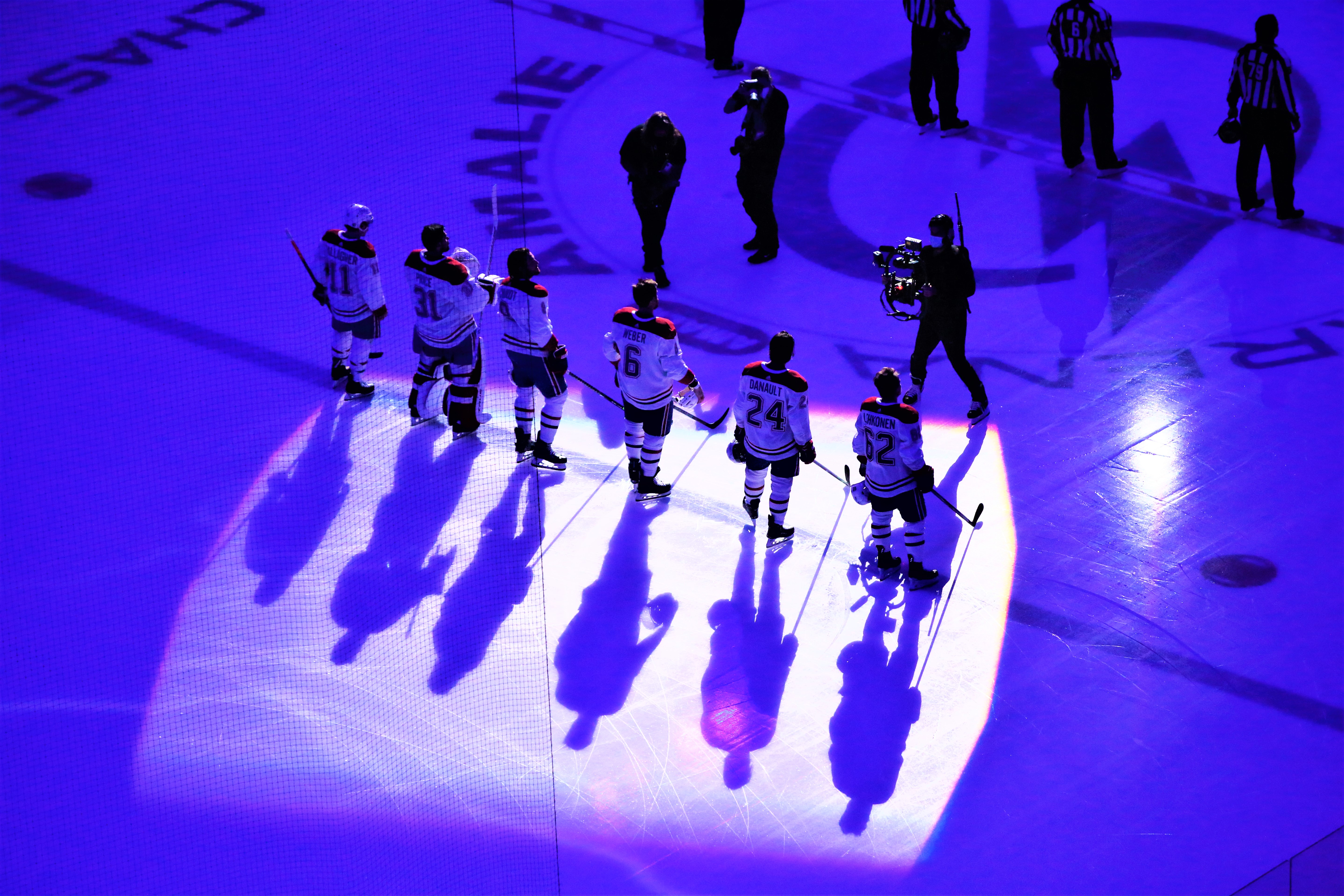 Humongous graphics projected on the ice highlight the players prior to the opening face off.