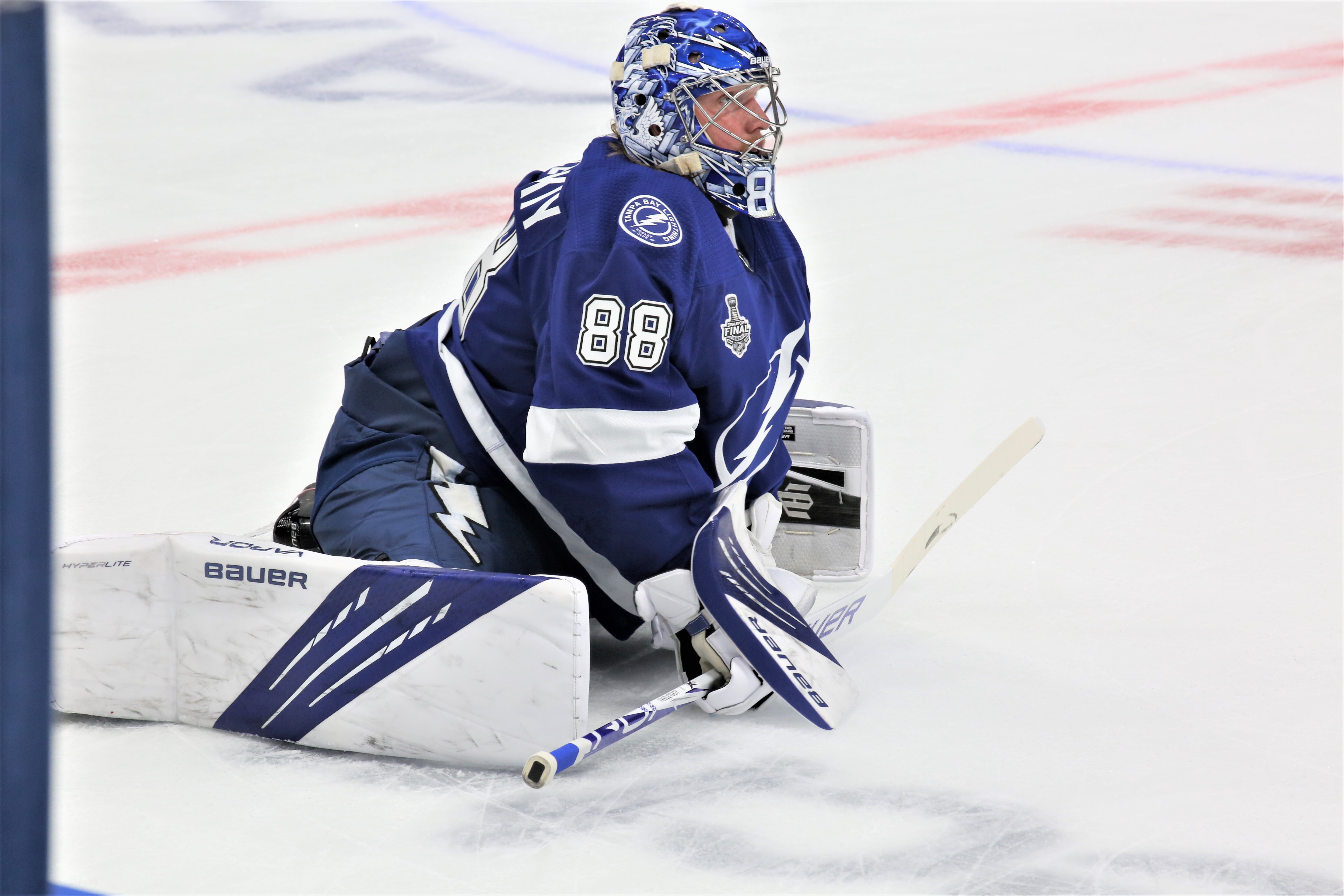 Lightning goalie Andrei Vasilevsky stretches prior to Game One of the Stanley Cup Finals Game One in Tampa Bay.