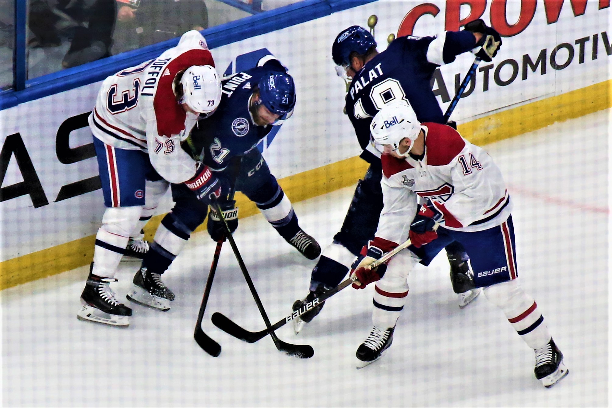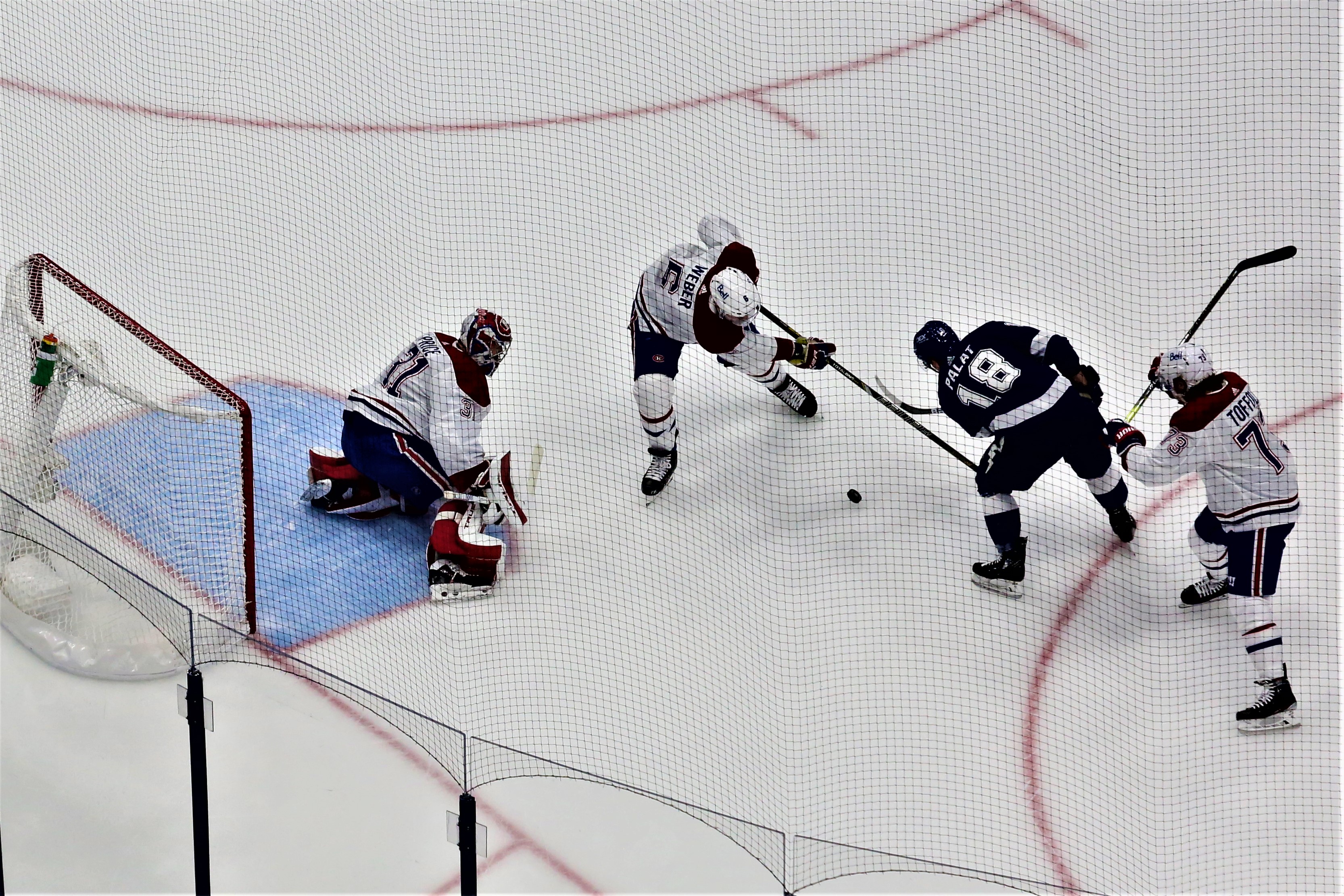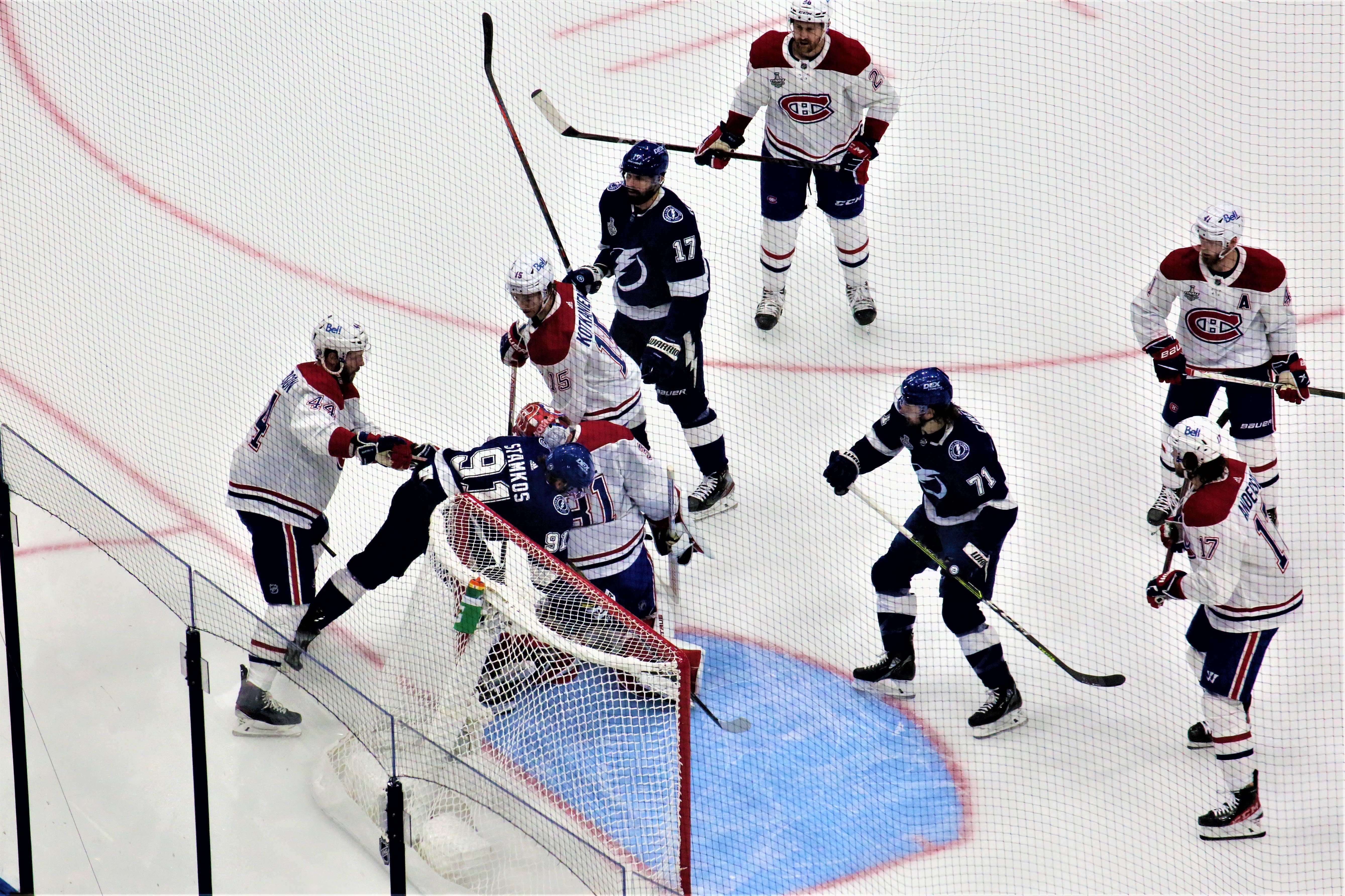Lightning players pile on in one of 27 shots on goal on their way to a 5-1 win over Montreal.