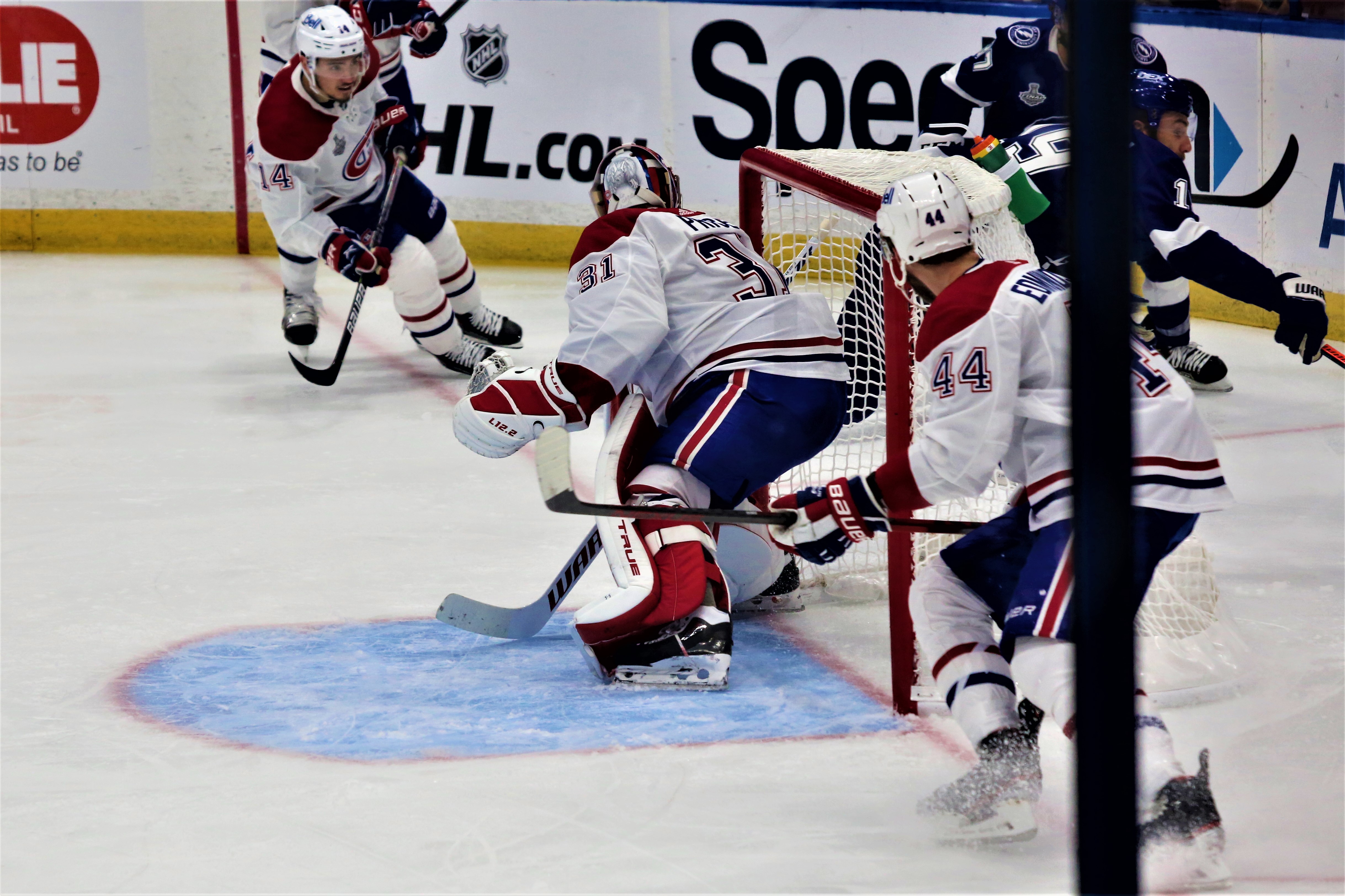 Montreal goalie Carey Price picks up a save on a shot by Alex Killorn.