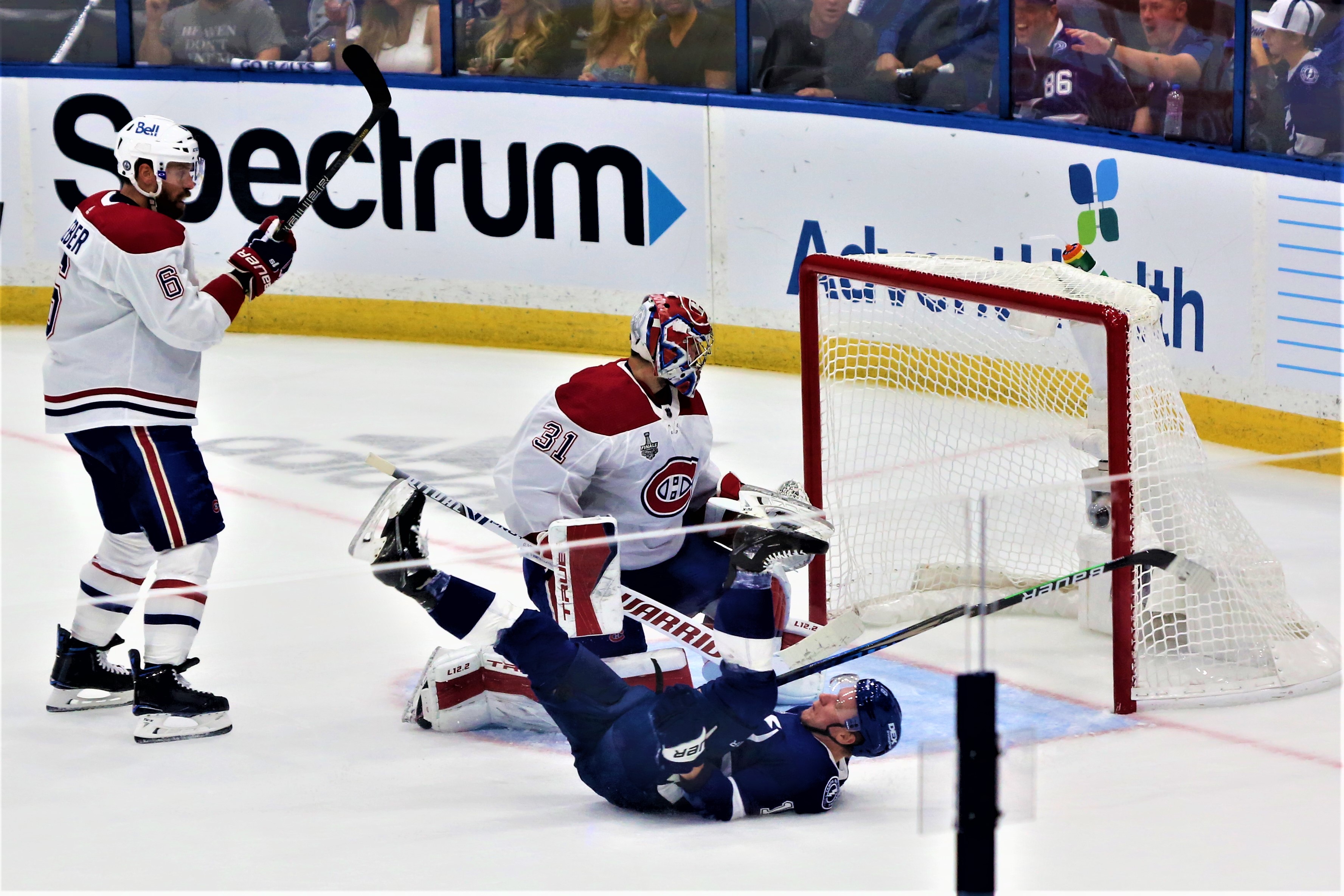 Ondrej Palat takes a tumble after a shot on goal.