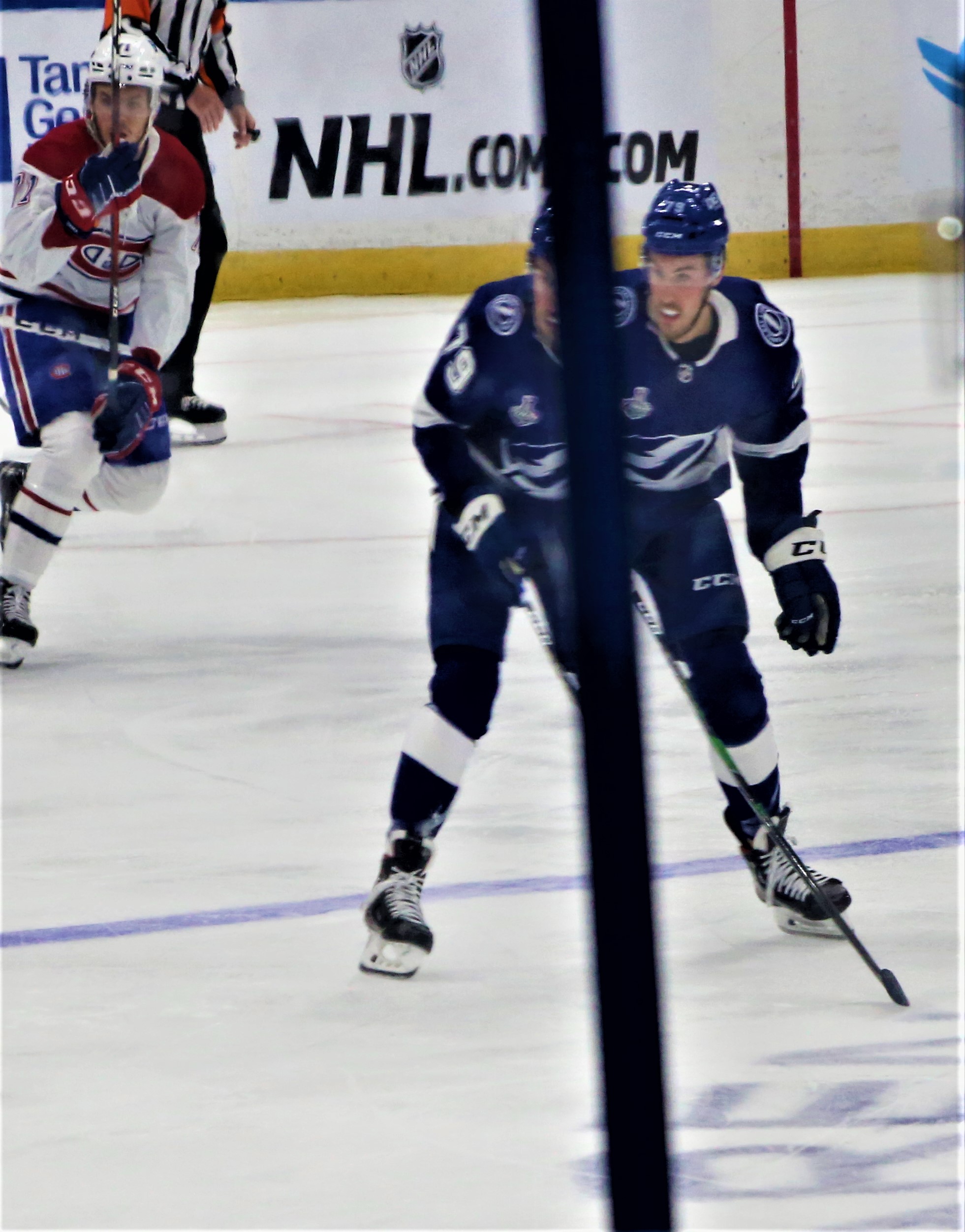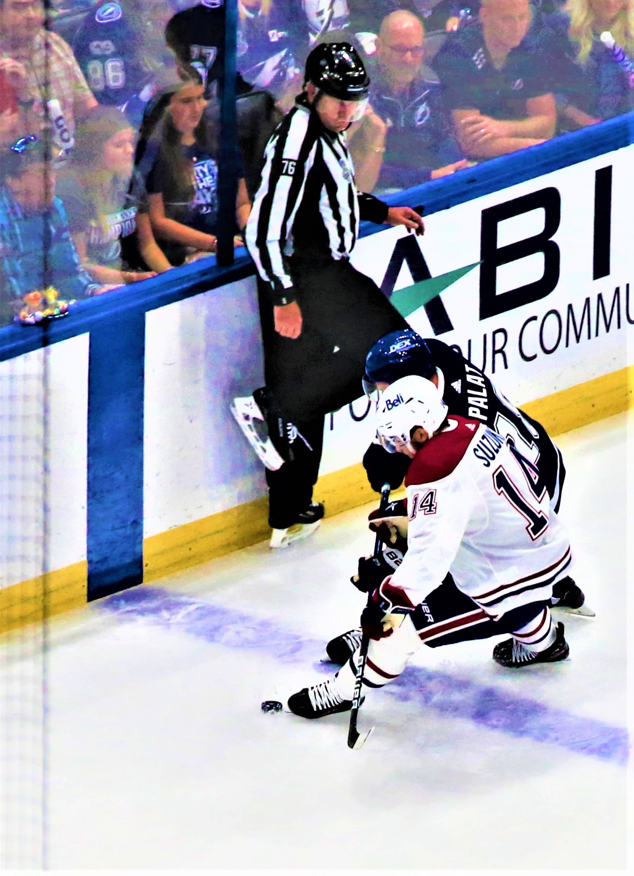 The referee sidesteps Nick Suzuki and Ondrej Palat as they fight for control of the puck.