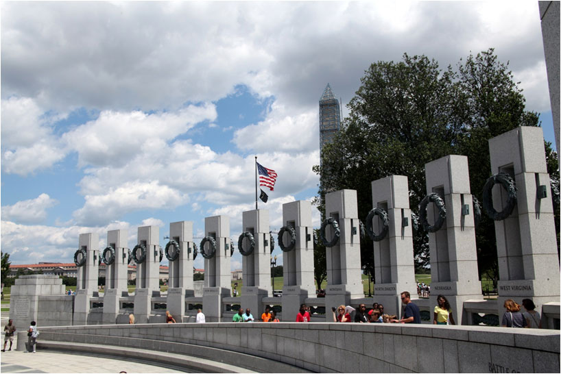 ![]() As the newest edition to the National Mall the WWII Memorial is popular with tourists |