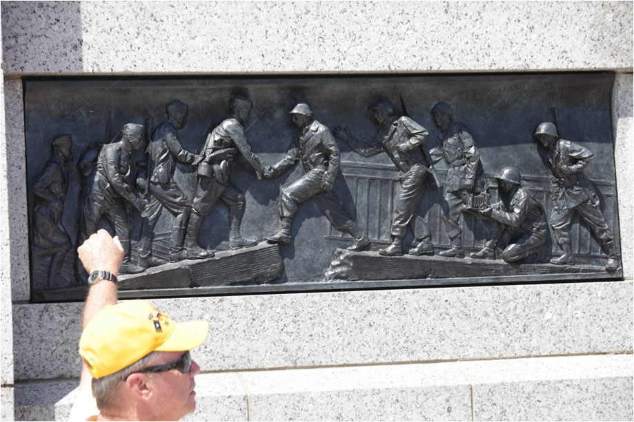 ![]() The only known sculpture of Russian soldiers in uniform in Washington, DC is found at the last panel at the Atlantic entrance. Shown are the Americans meeting the Russians at the River Elba, with photographer to record history. |
