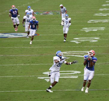 ![]() Defensive Back Scott Peek returns an interception for a huge gain as the Gators declaw the Kentucky Wildcats 65-5. |