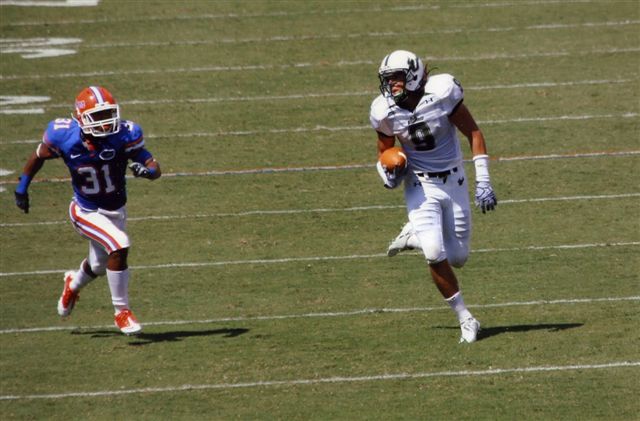| ![]() University of Florida cornerback Brian Biada zeroes in on University of South Florida wide receiver Evan Landi as the Florida Gators beat the USF Bulls 38-14. |