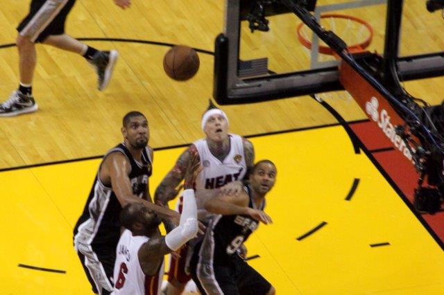 demoralizing loss as the Heat came from behind to force overtime. |  The Spurs' Danny Green gives the push to LeBron James after he sinks a