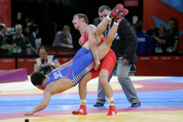 Tamas Lorincz of Hungary throws Korea's Hyeonwoo Kim for a loop in the gold medal 66kg Greco-Roman Wrestling match.