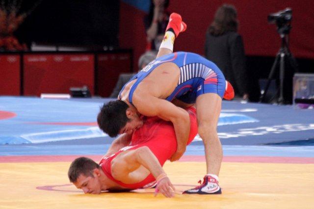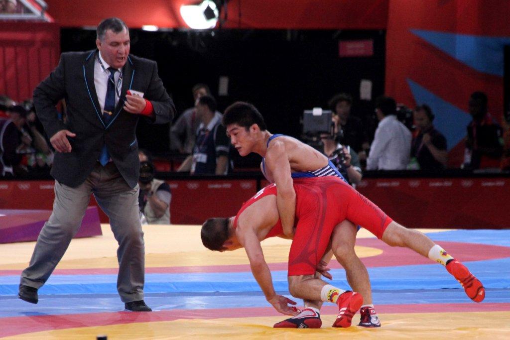 Korea's Kim has Hungary's Lorincz in a bind on his way to a 3-0 win and the gold medal.