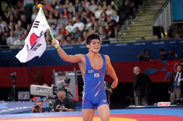 Hyeonwoo Kim of Korea -- his battered eyes swollen from Greco-Roman combat -- celebrates his gold medal win in the 66kg class.