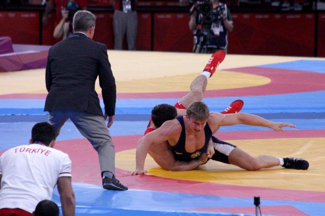 Cenk Ildem of Turkey appears to be manhandling Artur Aleksanyan of Armenia, but he would lose his 95kg match 3-0.
