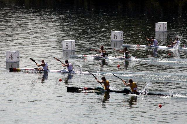 Leading in the mens's semifinal 200m kayak sprint at Eton Dorney are