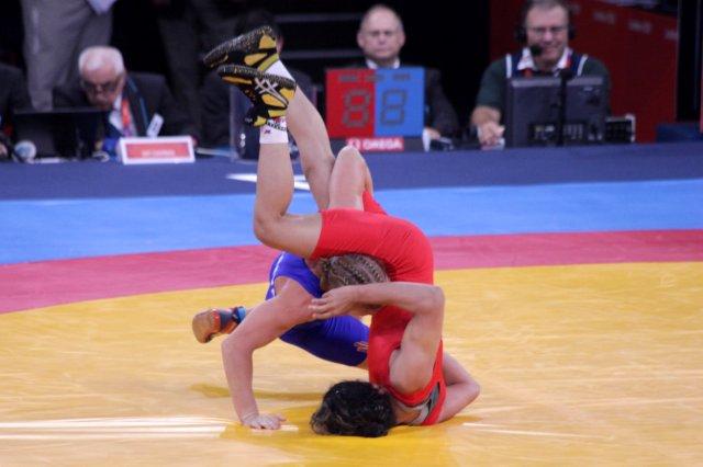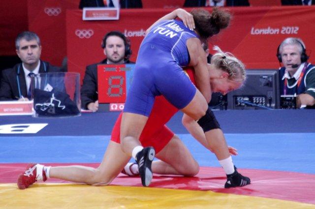 Sofia Mattsson of Sweden takes down Marwa Amri of Tunisia on her way to