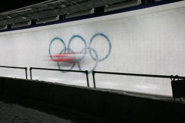 Matthias Guggenberger of Austria slides through the Olympic rings at the
